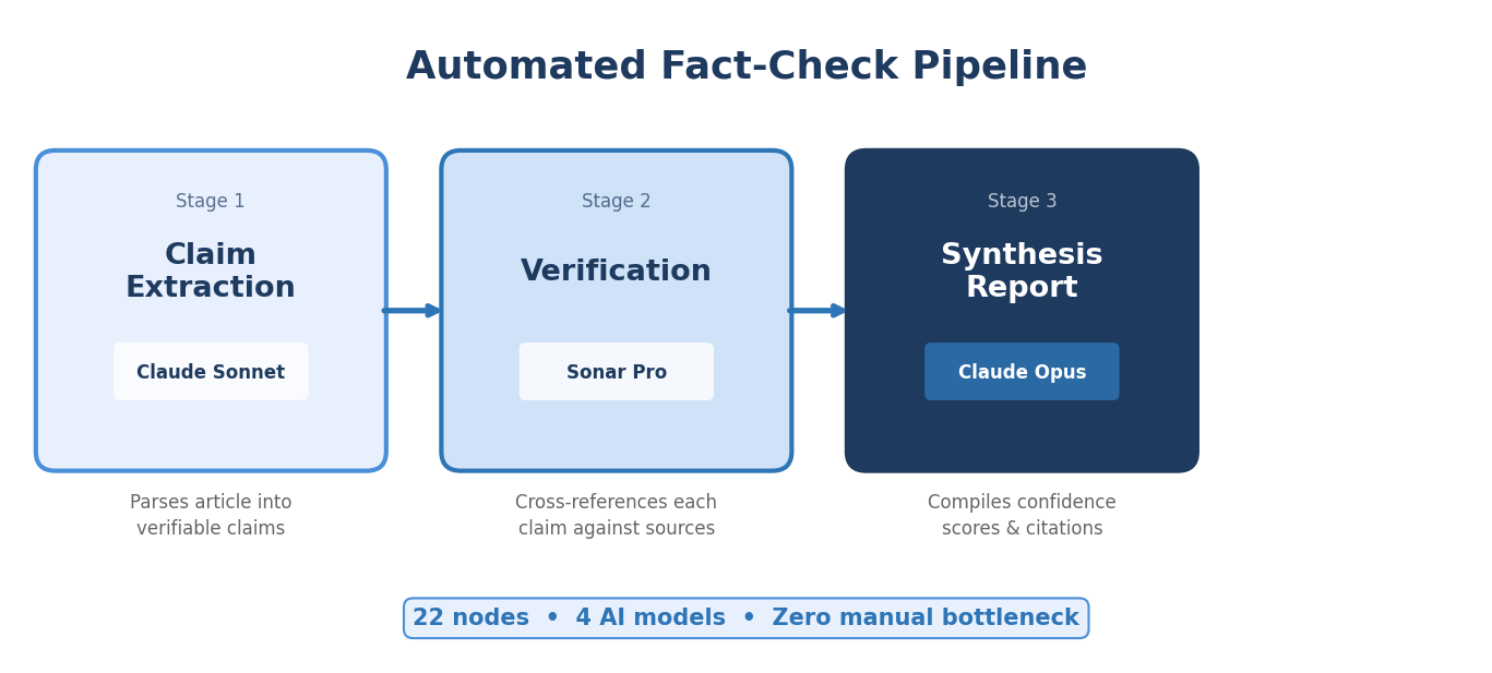 - The three-stage architecture (Claim Extraction, Verification, Synthesis Report) processes a 2,000-word article in under 3 minutes with four AI models working in sequence.