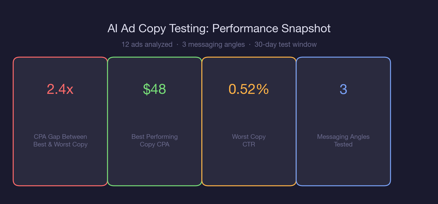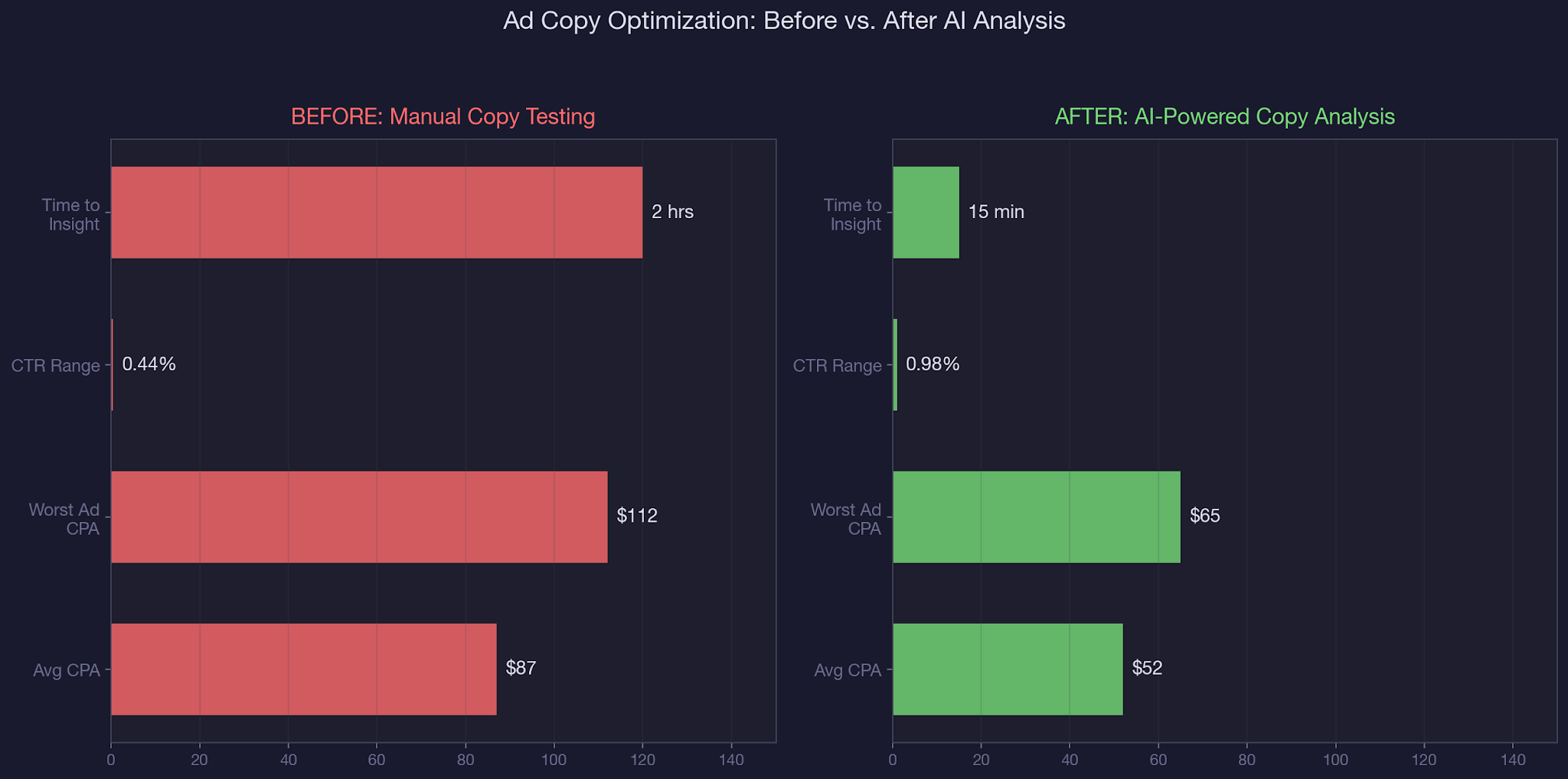 Results after 14 days: Average campaign CPA dropped from $65 (post-pause) to $51. The "specific-quantified" variant ($4,200/month hook) became the new top performer at $43 CPA. The team had fresh insights for their weekly reporting showing concrete copy-driven improvements.