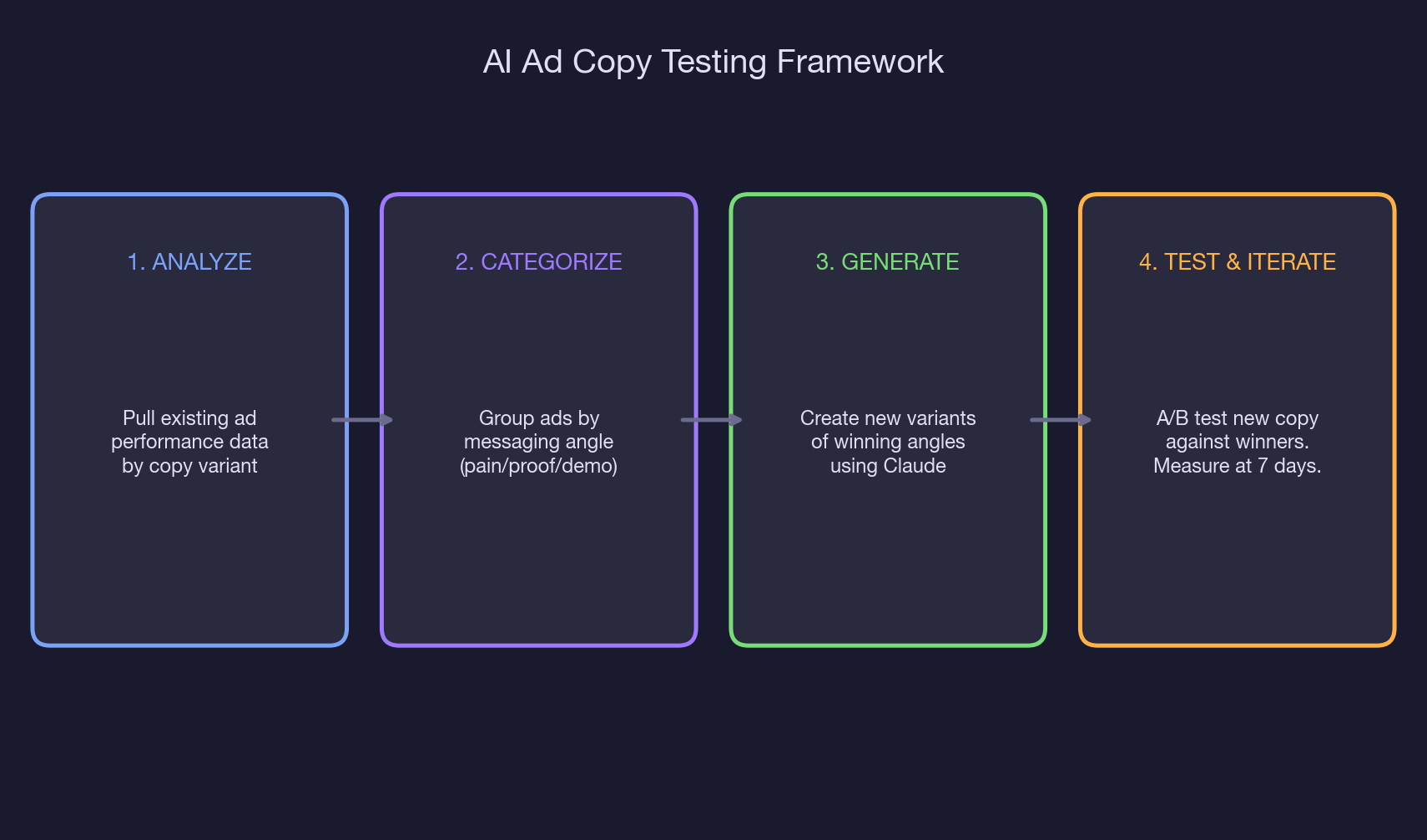 * Generate new copy variants by asking Claude to write 5 variations of your best-performing angle, keeping the same structure but testing new hooks, proof points, and CTAs.