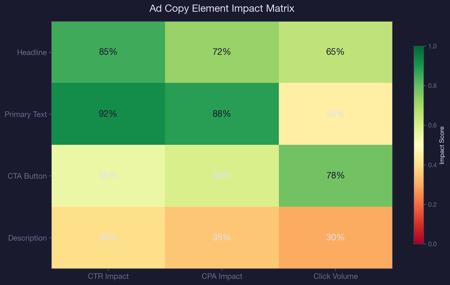 * The primary text (body copy) has the highest impact on CPA, followed by the headline. Description and CTA button text have minimal independent impact on conversion rates.