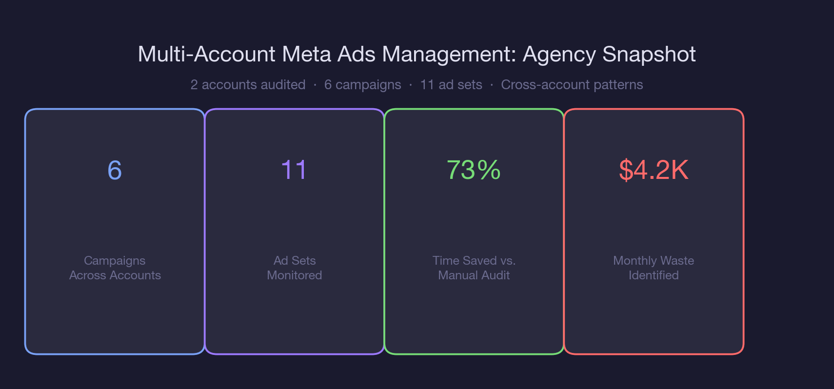 It reduces per-account audit time from 90 minutes to 15 minutes, surfaces cross-account opportunities that manual audits miss entirely, and enables prioritization by spend impact across the full portfolio. For an agency managing 10 accounts, that is 12.5 hours saved per week on auditing alone, plus the revenue impact of catching issues faster and sharing audience intelligence between accounts.
