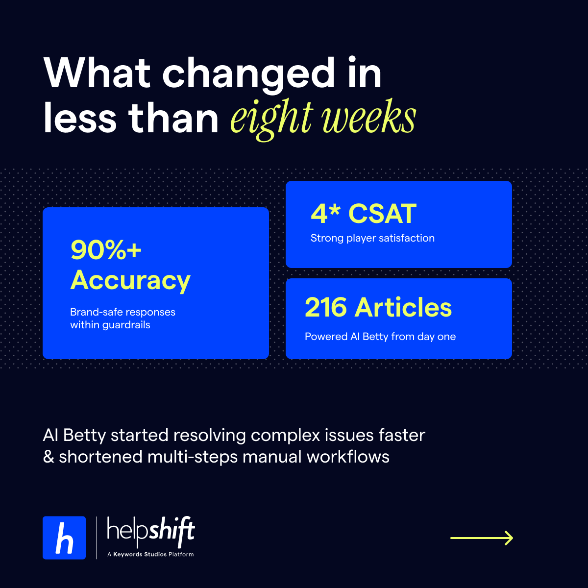 - MOFU accounts, familiar with Helpshift but not yet in active conversation, received proof-oriented content: case studies, testimonials, and gaming-specific impact metrics.