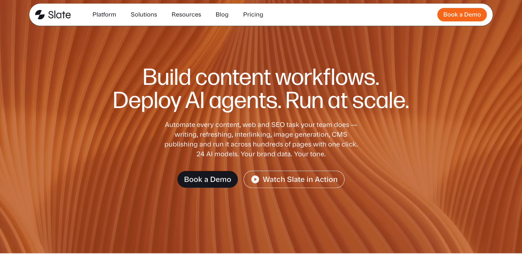 - Insight-to-action in one platform: Unlike tools that only surface data, Slate closes the loop by connecting AI visibility tracking directly to automated content workflows and CMS publishing.