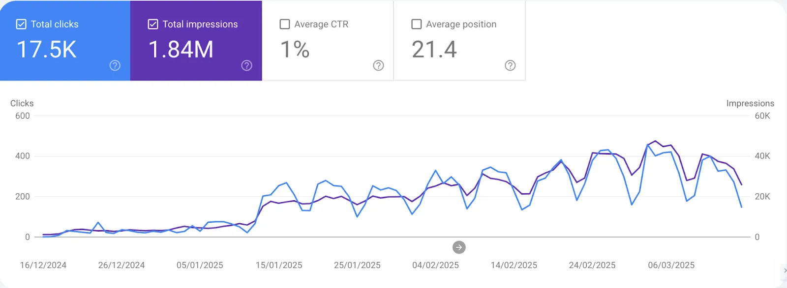 Search impressions jumped from 61,000 to 800,000+ monthly (1,200% increase)